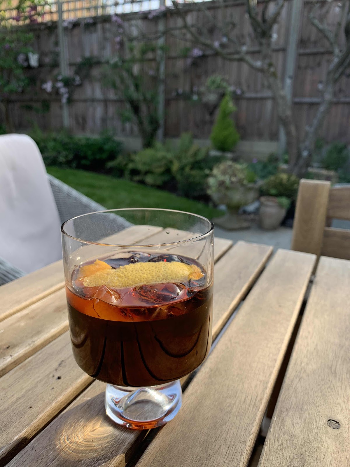 The basic recipe involves equal measures of gin, Campari and sweet red vermouth. This gives the drink a bitter but sweet and refreshing taste. The liquid ingredients are poured over a generous amount of ice in a tumbler. At this point my good friend stirs it with his special spoon, 12 times I think, and then it is garnished with a slice of orange.